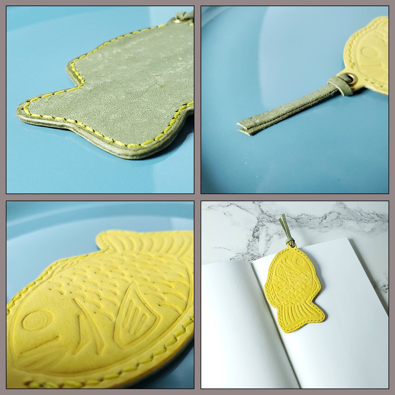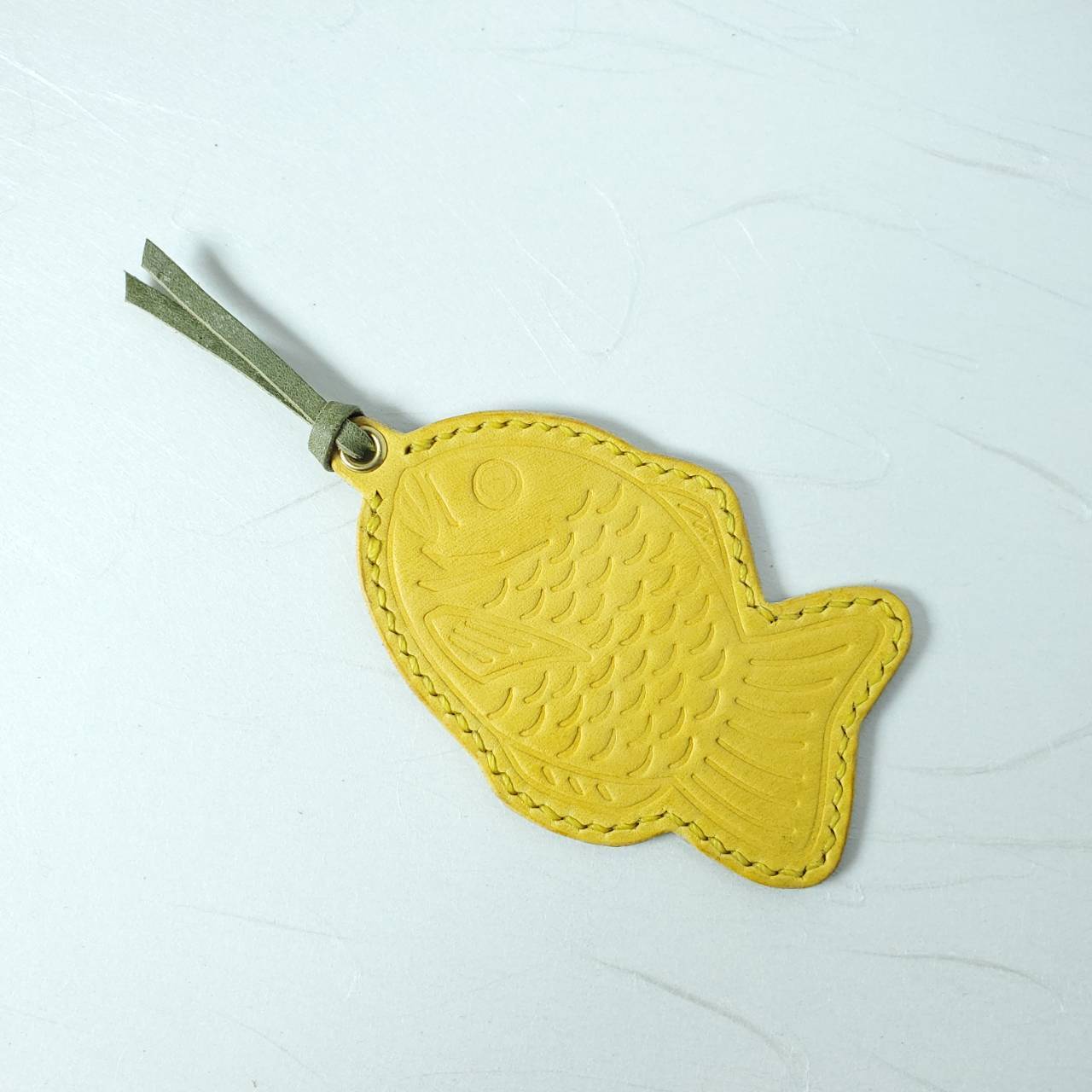 金具と持ち手の紐を付けたら、たい焼きしおりの完成!